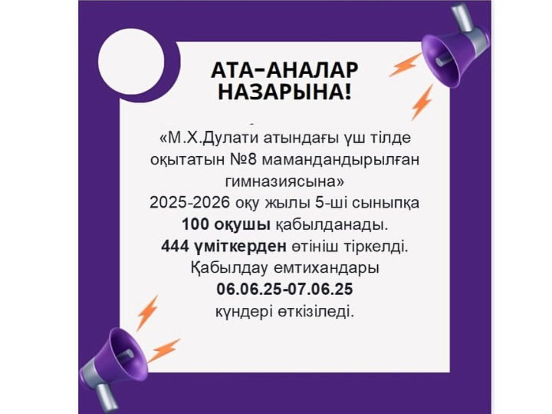 М.Х.Дулати атындағы үш тілде оқытатын №8 мамандандырылған гимназияның 2025-2026 оқу жылының 5 және 7-сыныптарына түсу үшін конкурстық іріктеу гимназия базасында 2025 жылғы 6 - 7 маусымда өткізіледі.